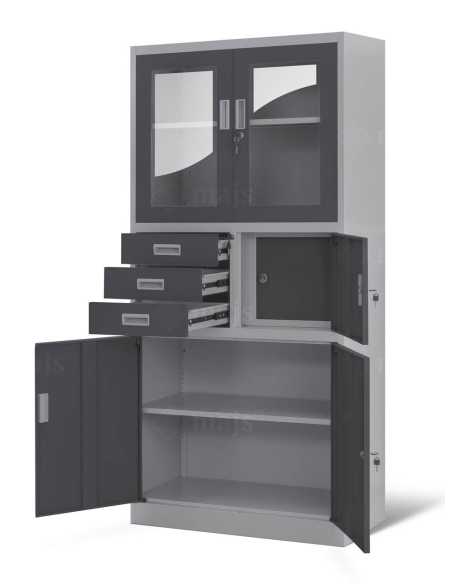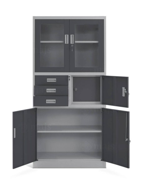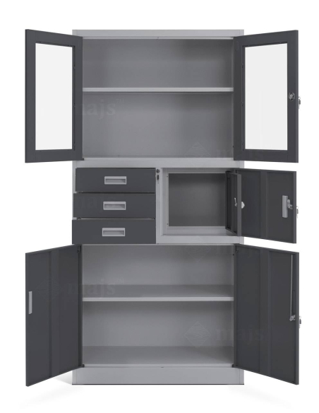 Szafa o konstrukcji metalowej wykonana z blachy o grubości 0.6 mm zapewnia stabilność i bezpieczeństwo użytkowania. Udźwig każdej półki to ok 50 kg. Każda z półek jest regulowana i może być dowolnie przestawiana co daje nam imponującą pojemność oraz szereg możliwości przechowywania i oszczędności przestrzeni magazynowej i archiwizacyjnej. Mebel wyposażony został w 3 funkcjonalne szuflady, zamontowane na solidnych i cichych prowadnicach. Dodatkowym atutem jest zamontowany sejf zamykany zamkiem szyfrowym i dodatkowymi drzwiczkami z zamkiem na klucz. Na swoje meble udzielamy 5 letniej gwarancji!