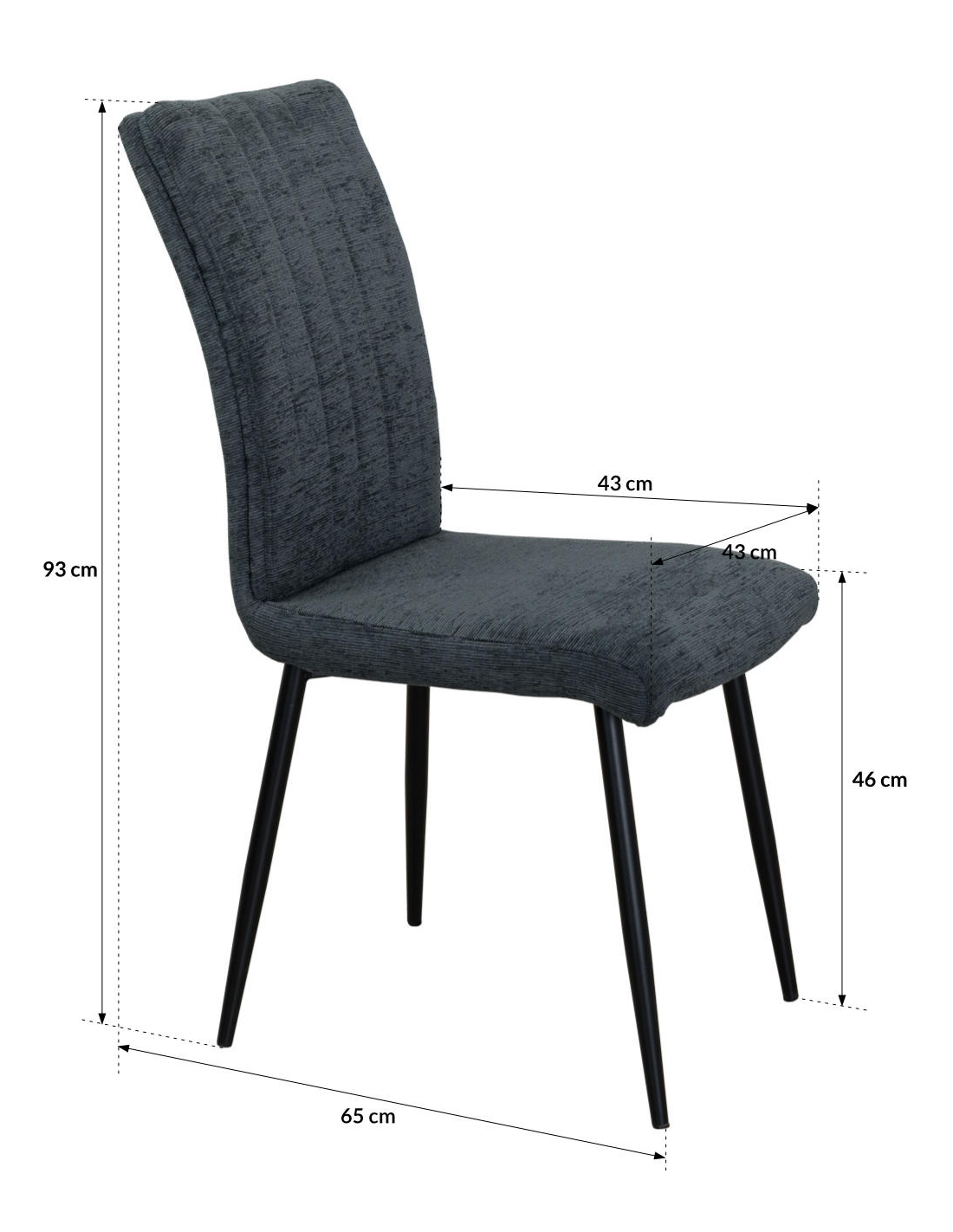 Metalowe nogi gwarantują stabilność i trwałość, a jednocześnie podkreślają nowoczesny charakter mebla. Wymiary krzesła to około 43 × 65 × 93 cm, dzięki czemu dobrze dopasowuje się do standardowych stołów jadalnianych.