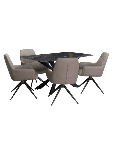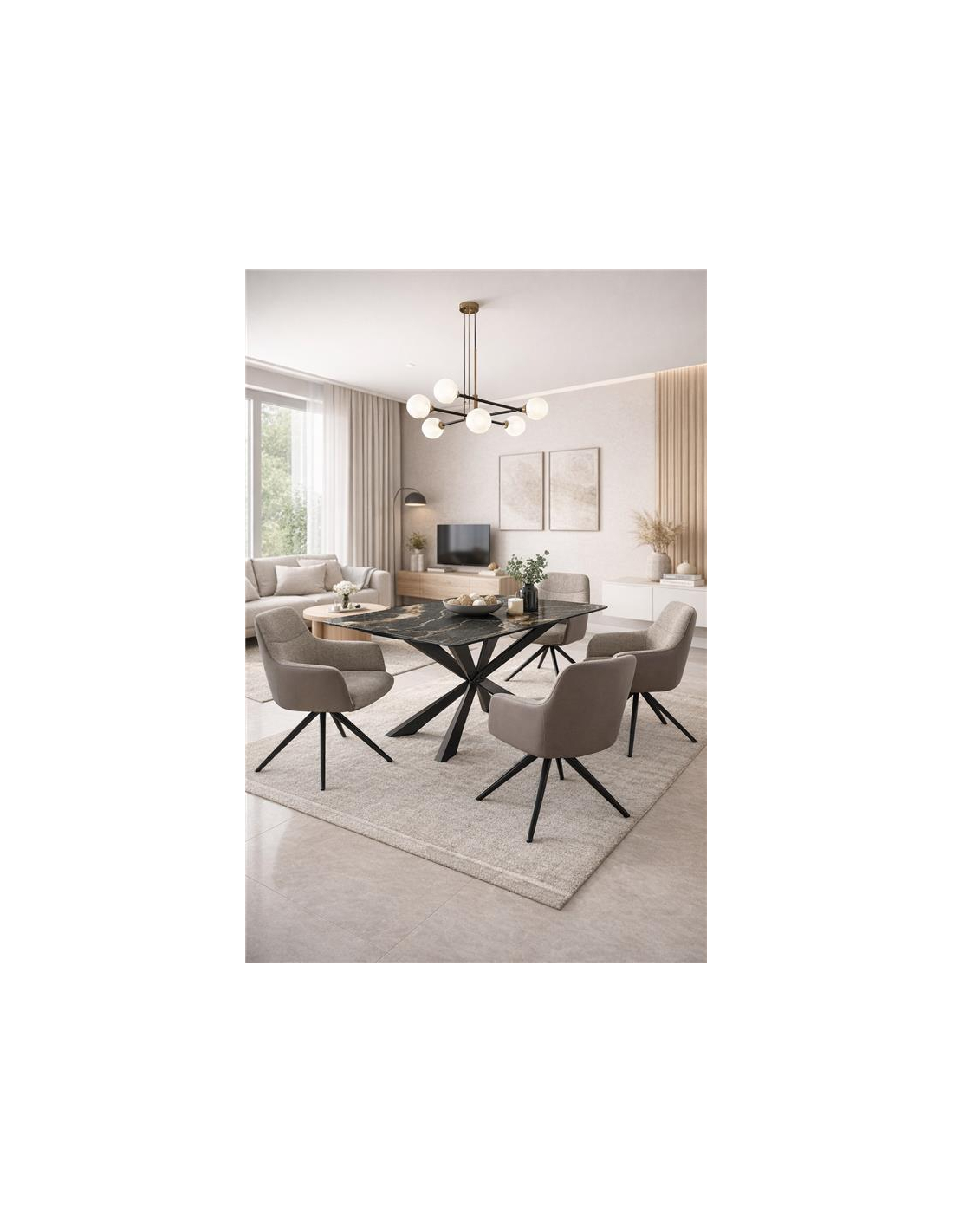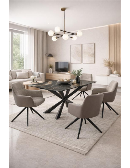 Połączenie ceramicznego blatu marmurowego i tapicerowanych krzeseł tworzy elegancką i komfortową przestrzeń do wspólnych posiłków oraz spotkań.